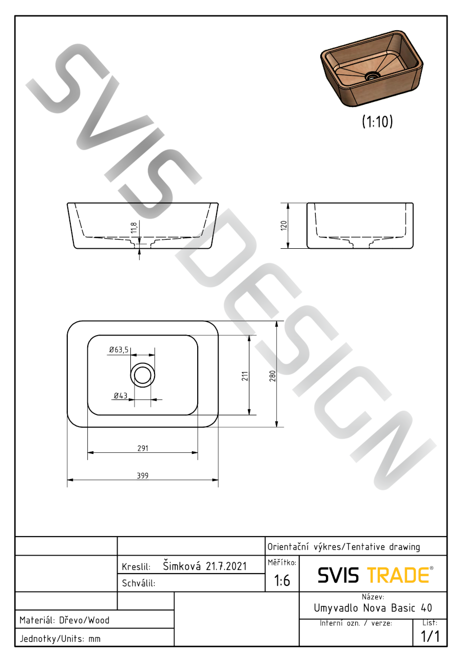 Sanitární zařízení. Designové bukové umyvadlo NOVA bez přepadu. Způsob instalace - na desku. Dodává se bez sifonu.