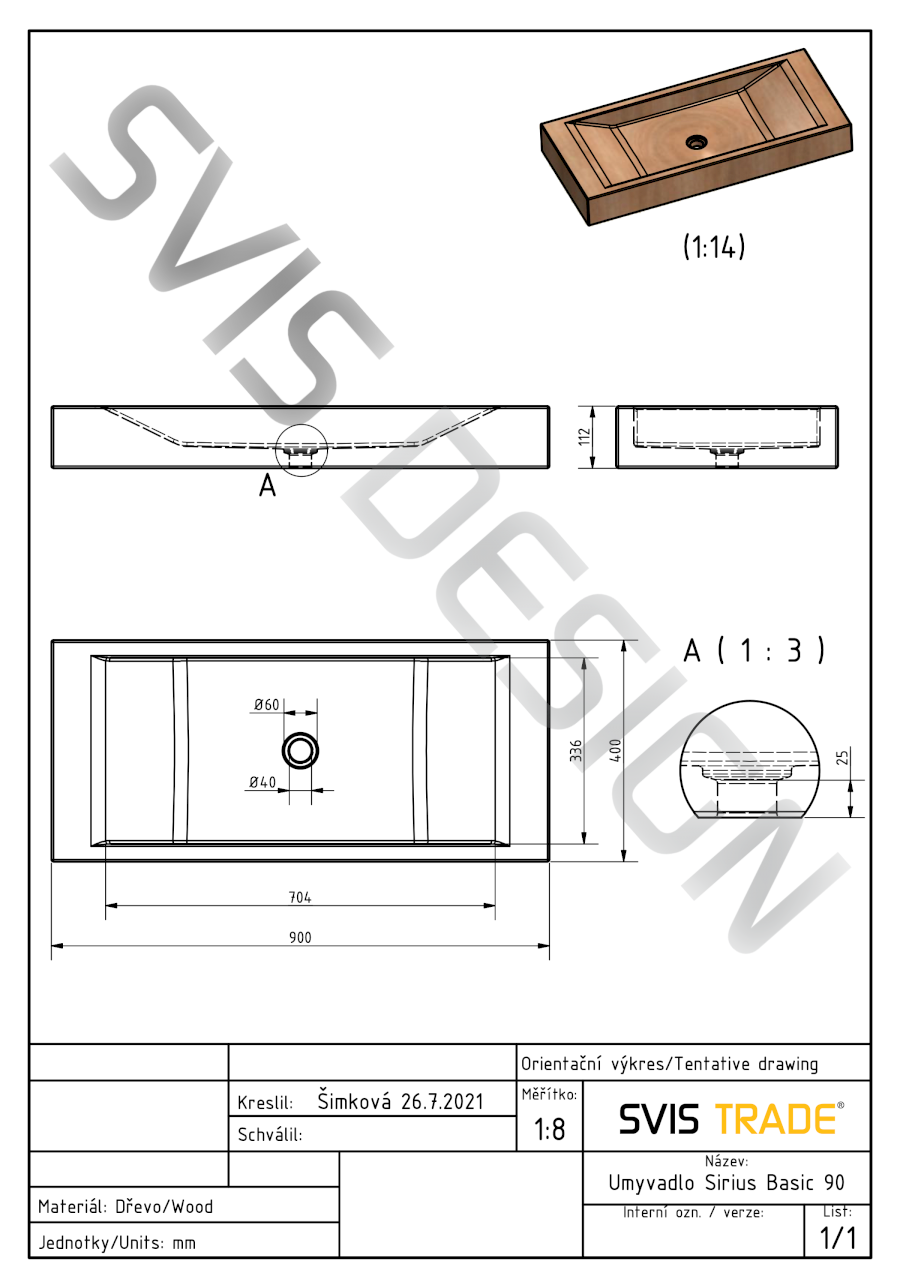 Sanitární zařízení. Designové dubové umyvadlo SIRIUS bez přepadu. Způsob instalace - na desku. Dodává se bez sifonu.