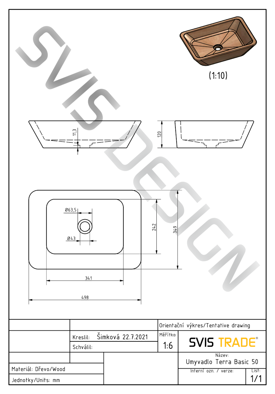 Sanitární zařízení. Designové bukové umyvadlo TERRA bez přepadu. Způsob instalace - na desku. Dodává se bez sifonu.