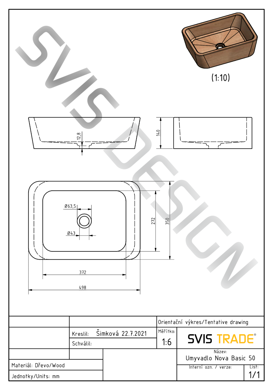 Sanitární zařízení. Designové bukové umyvadlo NOVA bez přepadu. Způsob instalace - na desku. Dodává se bez sifonu.