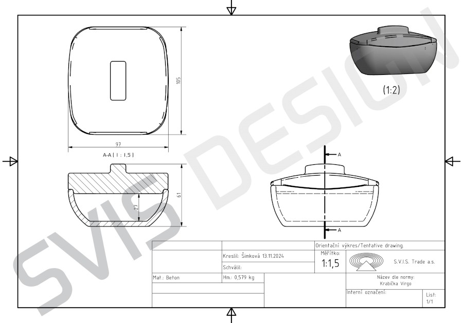 Kutija s poklopcem izrađena je po jedinstvenoj recepturi od kompozitnog materijala inspiriranog tradicionalnim betonom. Dekorativni predmet koji nadopunjuje dizajnersku seriju. Kombinacija kutije s poklopcem proširuje mogućnosti korištenja. Svaki proizvod je jedinstven zbog tipične manifestacije betona i ručne obrade. Mjehurići zraka i kamenac na površini karakteristične su značajke i ne mogu se smatrati nedostatkom. Boje proizvoda mogu se malo razlikovati od marketinških fotografija. Češki proizvođač S.V.I.S. Trade a.s. nositelj je certifikata ISO 9001, ISO 14001, ISO 45001